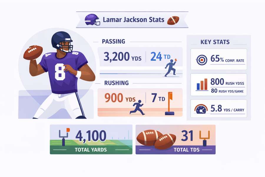 Lamar Jackson’s stats tell the story of a quarterback who changed expectations at the position. His blend of passing efficiency and historic rushing production places him in a category of his own.