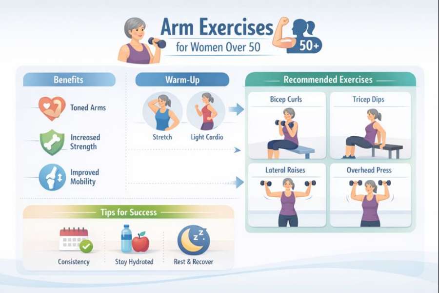 Arm exercises for women over 50 are about strength, function, and confidence, not chasing unrealistic ideals. With thoughtful movement, proper technique, and consistency, women can maintain strong, capable arms that support daily life and long-term health.